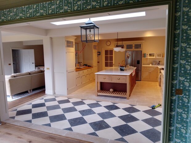 Elegant open-plan kitchen with bespoke cabinetry and a classic black-and-white checkered floor, designed for a spacious family home.” Keep it friendly and reflective of the project!